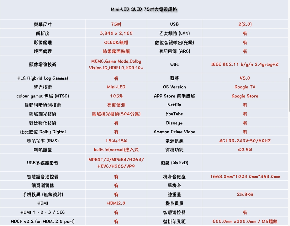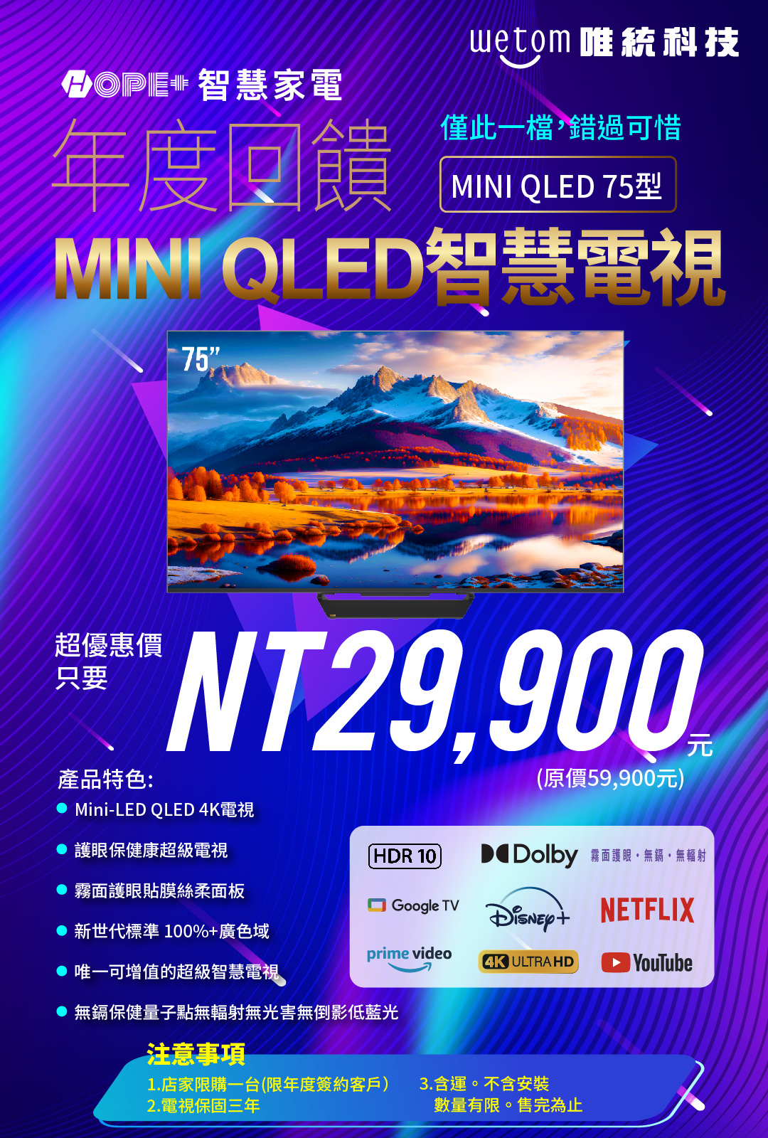 1.店家限購一臺(限年度簽約客戶) 2.電視保固三年, 3.含運。不含安裝 數量有限。售完為止